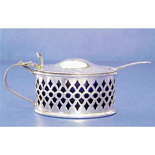 1920's 3 Pce.Silver Condiment Dish Beautiful Mustard dish, Made in England by L.W.I., Silver Plate, It has tiny spoon that fits perfectly and beautiful cobalt blue glass liner, This piece was used to serve mustard, or any condiment in small amounts - The spoon is sterling silver and it was made by J.S. and markings are: Birmingham, Lion and small u - Spoon measures 2 3/4: long and dish stands about 1" high and about 3" long - Gorgeous hinged lid, with the tiny tip to open up the dish , I love the "cut out" workmanship all around the dish, which shows off blue liner - This is PRECIOUS! - US Buyer to pay 6.00 for ship & insce. - International Buyers are very much welcome, Please email us about shipping cost - Thank You for looking!