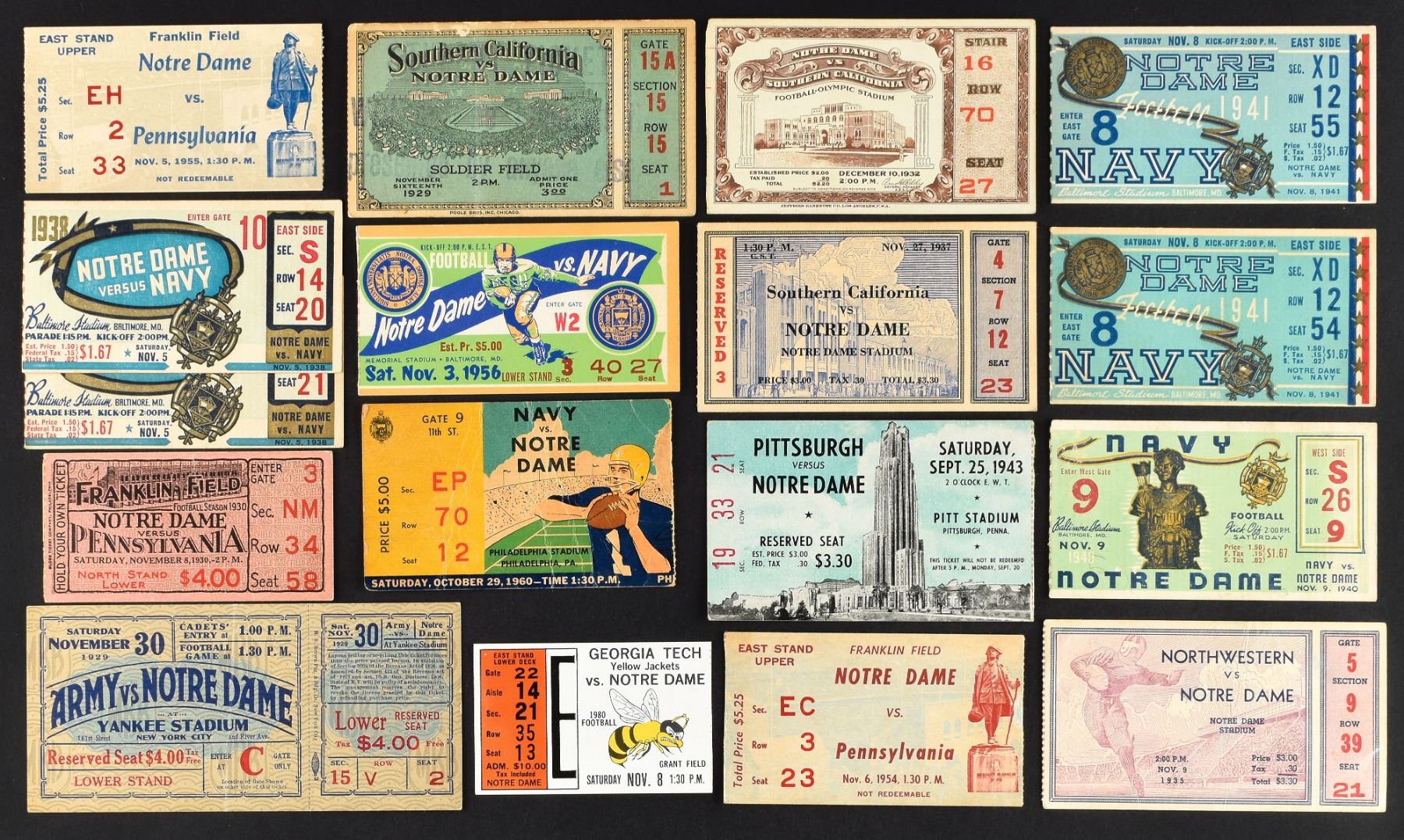 Includes: Notre Dame - 23 tickets with 1929 vs Army (appears EX, but w/crease down middle), 1929 vs. Southern Cal (GD), 1930 vs Penn (VG), 1932 vs Southern Cal (VG), 1935 vs. Northwestern (VG, crease), 1937 Southern Cal (VG/EX, ink), 1938 vs. Navy (2), 1938 vs Southern Cal (GD, crease-ink), 1940 vs Navy (GD/VG), 1941 vs Navy (2, both EX), 1943 vs Pitt (VG/EX), 1951 vs Indiana (EX). 1954 vs Penn (GD), 1955 vs. Penn (VG, pencil), 1956 vs Navy (EX), 1960 vs. Navy (GD), 1956 vs Duke (EX), 1968 vs. Navy (FR), 1968 vs Southern Cal (FR), 1968 vs. Southern Cal (EX). 1980 vs. Georgia Tech (EX).