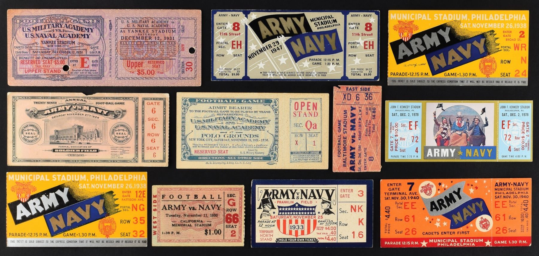 Army vs. Navy - 21 tickets with 1901 (GD, paper loss reverse), 1925 (VG/EX), 1926 National Championship Game (FR/GD, chip at top, couple creases, pencil reverse), 1930 (VG), 1931 Yankee Stadium PROOF (VG), 1933 (VG/EX), 1938 (3), 1940 (FR, staple holes), 1940 (VG/EX), 1944 National Championship Game (FR, back damage), 1947 (2, VG and GD), 1950 (VG/EX), 1953 (VG), 1954 (GD/VG), 1958 (GD/VG), 1960 (VG), 1978 FULL (EX) and 1985 (FR).