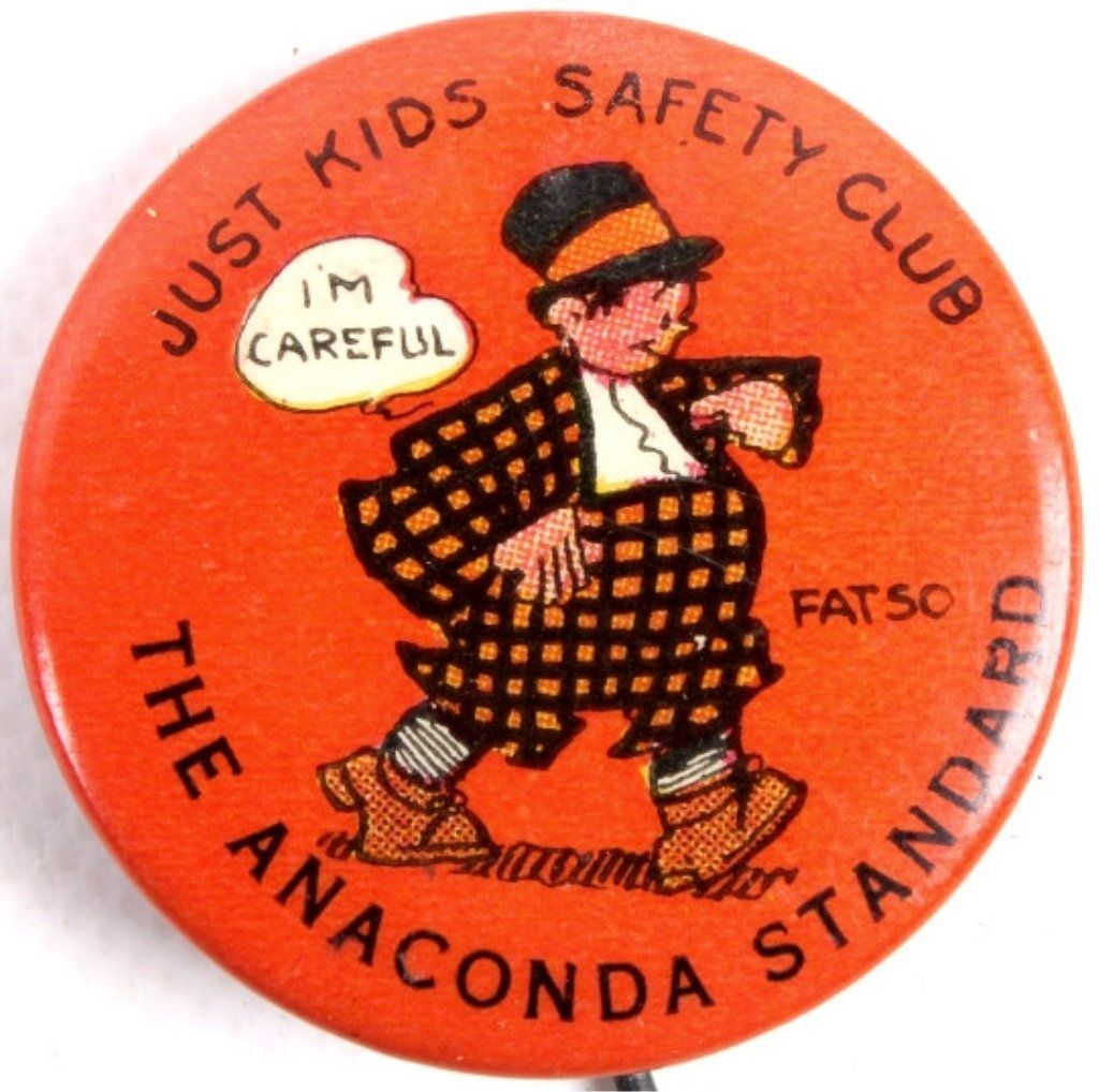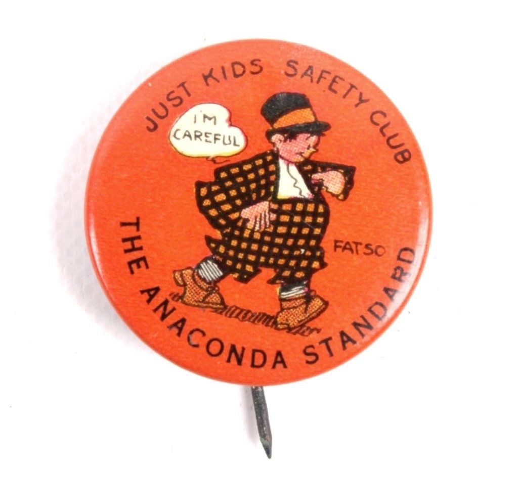 This reads, "Just Kids Safety Club 'Im Careful Fatso' The Anaconda Standard." This pinbacl premium button is from the early 1920's. Measures 1.25" diameter.