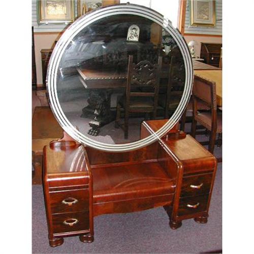 We are pleased to offer this Beautiful Circa 1920's Art-Deco Vanity with very large Mirror. Made out of Walnut it has it's original hardware, four drawers that open and close smoothly. Beautiful wood grains and very clean, we gave this piece a fresh coat of wax to enhance the woods beauty. Only imperfections this piece has is three pieces of veneer that have been replaced, two small pieces on the front center and one larger one on the right side, all are not bad and can be seen from the attached photo's. Beautiful piece of furniture that would make a wonderful addition to any home and a great investment as well. For additional photo's or information on this piece please contact us by clicking on the "EMAIL DEALER" button, we'll be happy to supply you with any information on this piece that is requested including a shipping quote if needed. Thank you for looking.