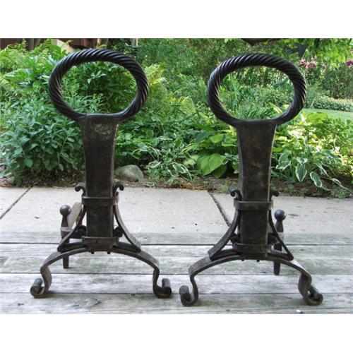 Substantial 1920's Arts and Crafts hand-wrought iron fireplace andirons, with quality artistry and craftsmanship. Measuring approximately 23 inches high, 13.5 inches wide, and 23.875 inches deep, each andiron weighs about 23 pounds. The excellent hand-forging is evident in these pieces, from the twisting of individual strips into a massive circular top to the overlapping iron strapping to the rolled feet. The andirons are in very good condition, solid and sturdy, with light surface wear and oxidation. Please refer to the 4 photographs for appearance and condition. Shipping / packaging will be $30 - $60, depending upon the zipcode of the buyer. (Free shipping, within the lower 48 states, to the winner of this auction!)