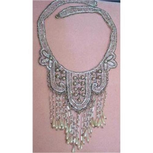 GORGEOUS, UNIQUE,HAND BEADED BIB NECKLACE OR A COLLAR, EXQUISITE WORKMANSHIP, AS A RESULT FABULOUS ANTIQUE PIECE, EXCELLENT CONDITION CONSIDERING AGE, THERE ARE TWO STRANDS THAT HAVE CHIPPED PEARL, AND ONE WITHOUT, NOT SOMETHING THAT IS VISIBLE UNLESS YOU ARE LOOKING FOR A FAULTS AS I DID., MEASURES ABOUT 16" LONG AND ABOUT 7" WIDE AT IT'S WIDEST POINT.US BUYER TO PAY 4.00 FOR SHIPPING PLUS INSURANCE.THANKS.