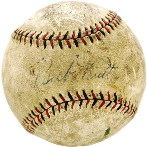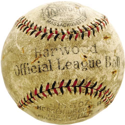 <B>1920's Babe Ruth Single Signed Baseball.</B></I> The quotation marks around the "Babe" on the sweet spot of this Harwood Official League ball assure that this one dates from the glory days of Murderer's Row, around the time the Bambino clubbed sixty in a season. While not an official ball, the red and blue stitching gives the look of one, and the blue ink still projects as a nice 7/10 from the toned horsehide. The alternate panels show a fair amount of scuffing, and one has a bit of writing in an unknown hand, but this is definitely not another signature, nor does it affect the display. A fine early Ruth solo. <I>LOA from PSA/DNA. LOA from James Spence Authentication.</B></I><BR><BR><b>Shipping:</b> Balls, Pucks, etc., Small (<a target="_blank" href="http://www.heritageauctions.com/common/shipping.php">view shipping information</a>)