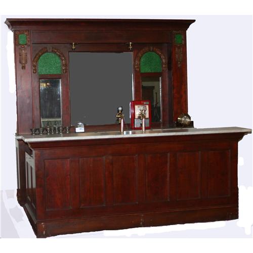 1920's Soda Fountain Back Bar with matching Front Service Bar. Mahogany with heavily carved appliques. Emerald green slag glass inserts. Original white marble. 94"H c 96"W x 18"D.