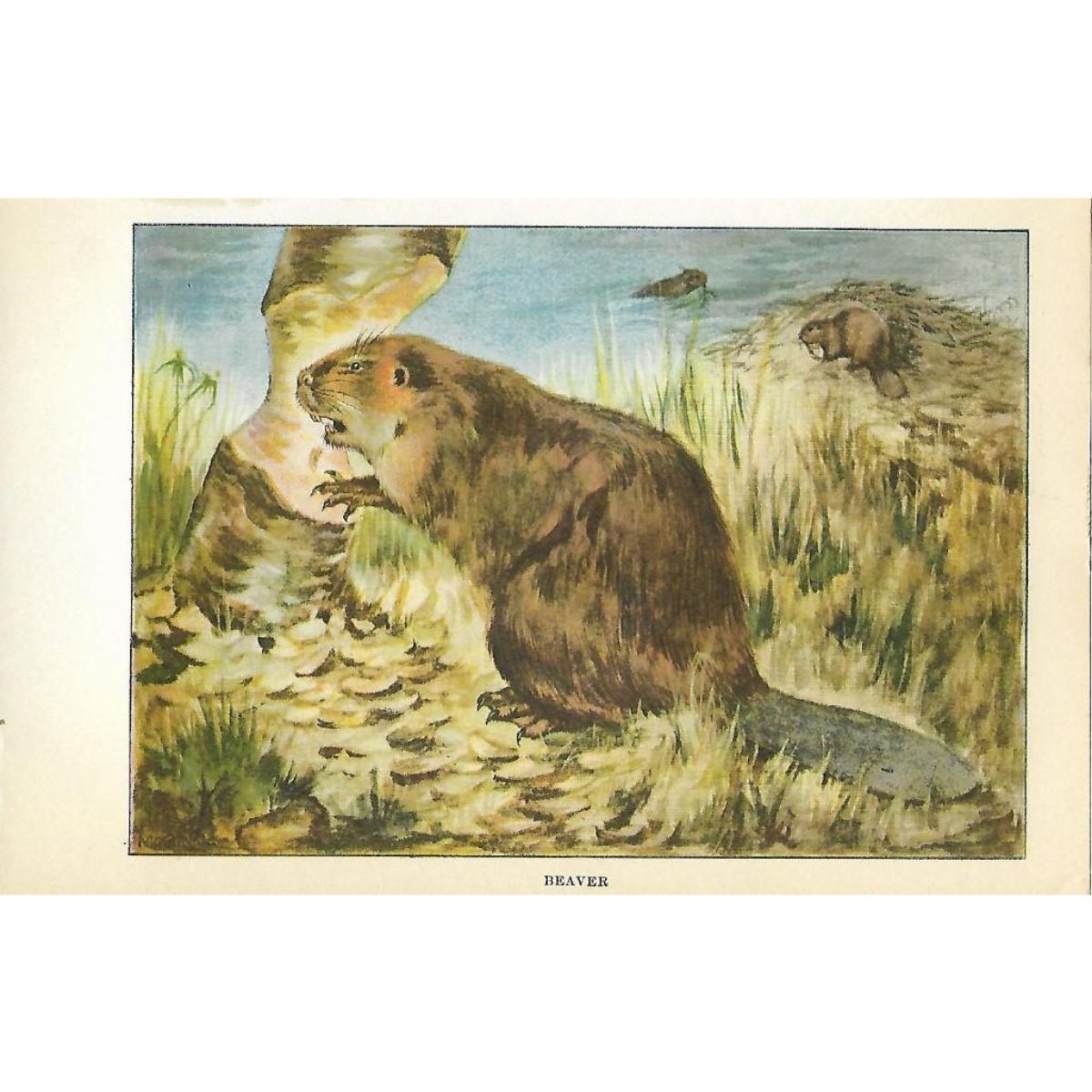 Beaver color lithograph print, from a 1926 edition of The Nature Library, Animals by Ernest Thomas Seton, artwork by McGinn. 5" X 8".