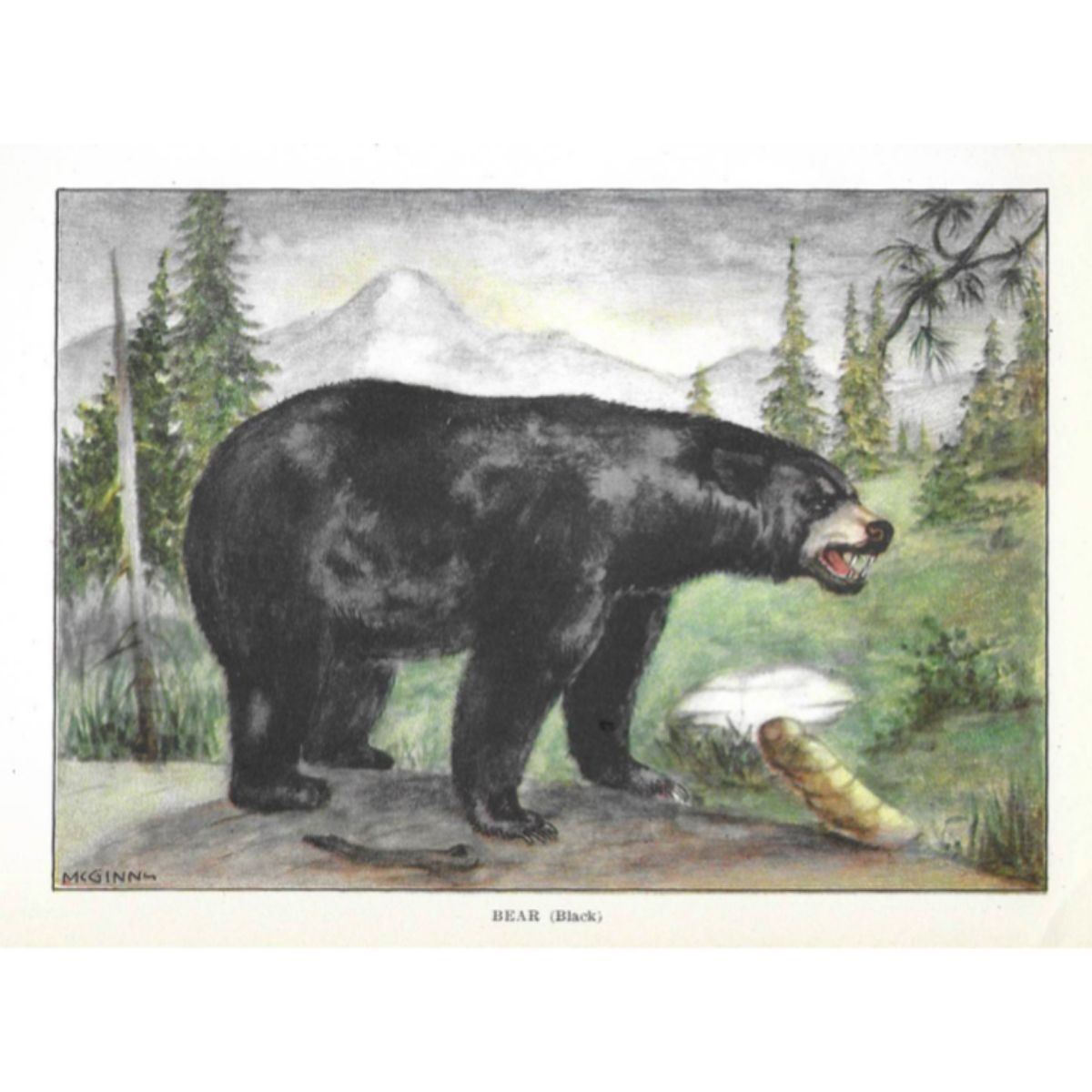 Black Bear color lithograph from a 1926 edition of The Nature Library, Animals, by Ernest Thompson Seton, arranged by Robert M McCurdy for Doubleday, Doran & Company. Original artwork by McGinn. 5" X 8".