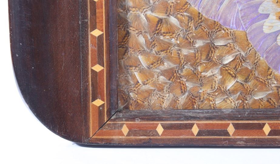 Featured in this lot we have a butterfly wing inlayed serving tray originating from the 1920's. The tray shows mahogany construction with a wood inlayed veneer around the interior. The interior of the tray displays beautiful patterns and designs all made out of inlayed butterfly wings. The wings show colors and patterns of yellow, orange and dark brown, iridescent purple and blue, and many others. The display shows the wings for over seven different species of butterfly. The tray shows good condition overall with some minor wear. The piece measures 24 3/4" long by 15 1/4" wide.