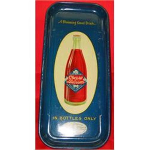 1920's Cherry Blossoms Serving Tray. The glare in the picture covers the Good Housekeeping Seal of Approval. It reads "Tested and Approved by the Good Housekeeping Bureau of Foods, Sanitation and Health Conducted by Good Housekeeping Magazine @1914." This is an unusual older tray in good condition. There are some minor surface scratches, knicks, and rust spots mostly on the blue background. The bottle itself is in very good shape with only a superficial scratch on it. The rim does have wear, mostly on the two side edges. The rust spots mainly appear along the rectangular indention in the blue background that is inset in the tray. The tray's back is black and shows normal tray wear and scrapes. Despite the way this sounds, this is a great tray and getting harder and harder to find. I am picky and would rather give you all the details up front.
