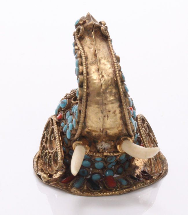 1920's Chinese Tibet/Nepal brass elephant with red coral, black coral and blue turquoise. SIZE: see attached ruler photo. Photos are part of the description representing the condition report and can be used for authentication prior to the sale date. Pangaea Auctions urges Bidder's to view all attached photos in detail.