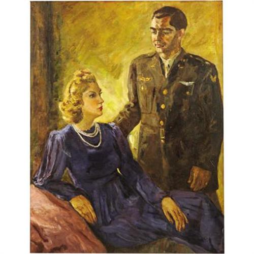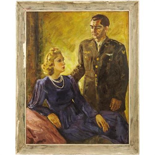 <B>1920's Christy Mathewson Personally Owned Portrait of Himself with Wife.</B></I> Finely rendered portrait of Big Six and his bride finds the former in his World War I military uniform, returned from the front after suffering the training accident that would ultimately bring a premature end to his life. The damage caused to his lungs by the inhalation of chlorine gas while serving as a Captain in the newly established Chemical Service would bring Matty to develop tuberculosis, and lead his doctor to prescribe clean, fresh air as a method of rehabilitation. It is this move that allows us to definitively authenticate the painting, as it comes to us along with its original shipping crate, addressed to "Mrs. Christy Mathewson, Old Military Road, Saranac Lake, New York," where Mathewson would pass away in 1925 at the age of forty-five. Further proof comes in the form of a second affixed shipping label, directing the crate to an address in Lewisburg, PA, where Christy's widow passed away in 1967 at eighty-seven years of age. The oil on canvas work has been carefully preserved over the decades, and exhibits no flaws of note. The original frame shows some weathering, but this only adds to the vintage charm. The wooden shipping case shows expected handling wear, but serves perfectly in its role of provenance establishment. One of the few Christy Mathewson owned articles ever to make it to public auction, and among the best for display.<BR><BR><b>Shipping:</b> Framed - without Glass, Large (<a target="_blank" href="http://www.heritageauctions.com/common/shipping.php">view shipping information</a>)