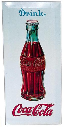 Nice bevel edged sign over cardboard with original string hanger. Measures 6"x13.25". Features nice quality overall restoration and has been brought up to a cond. of approx. 8.0-8.5. Most of the restoration was centered around the white background, although a few scuffs and scratches on the bottle and logo areas have been touched up as well. Still has a few shallow crimp, dents, marks, and edge wear.