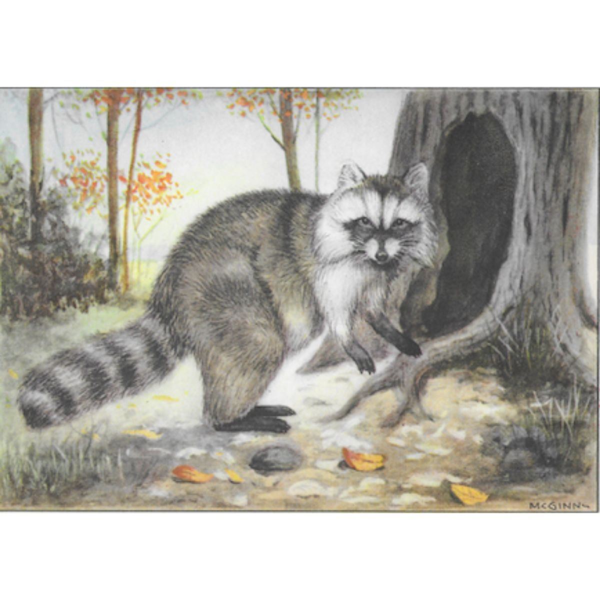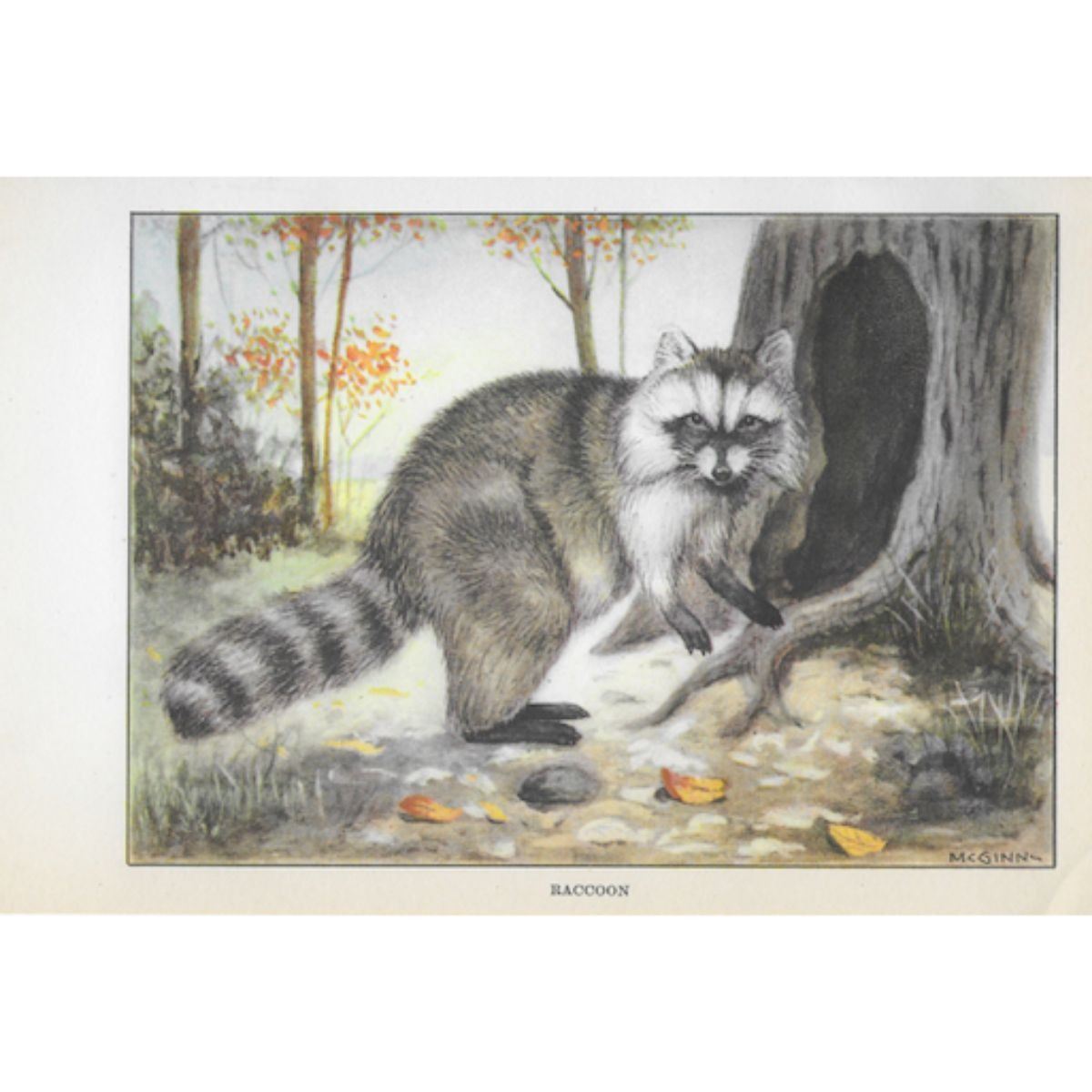 Raccoon color lithograph print, from a 1926 edition of The Nature Library, Animals by Ernest Thomas Seton, artwork by McGinn. 5" X 8".Â