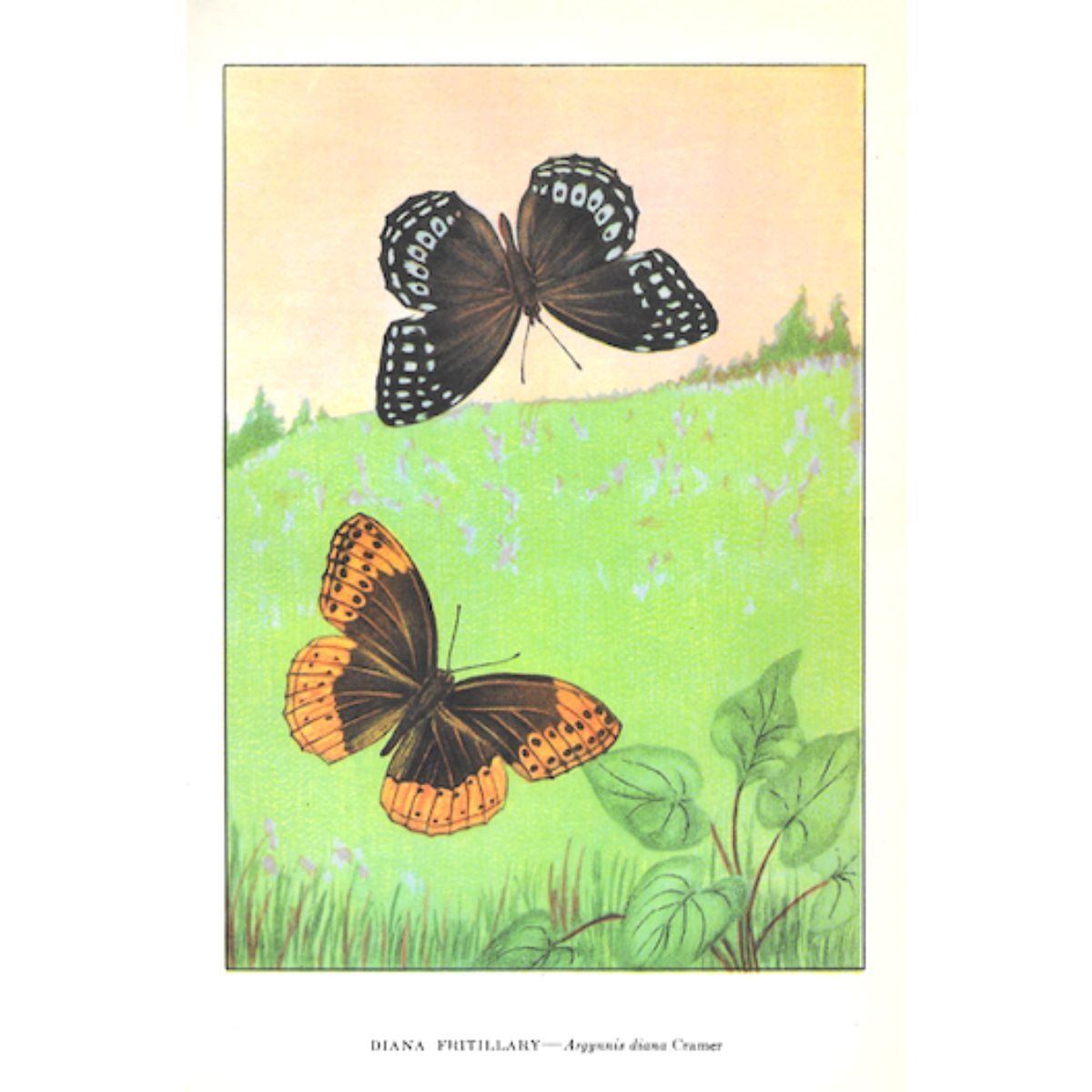 Diana Fritillary butterfly color lithograph print, from a 1926 edition of The Nature Library, Animals by Clarence M. Weed. 5" X 8".