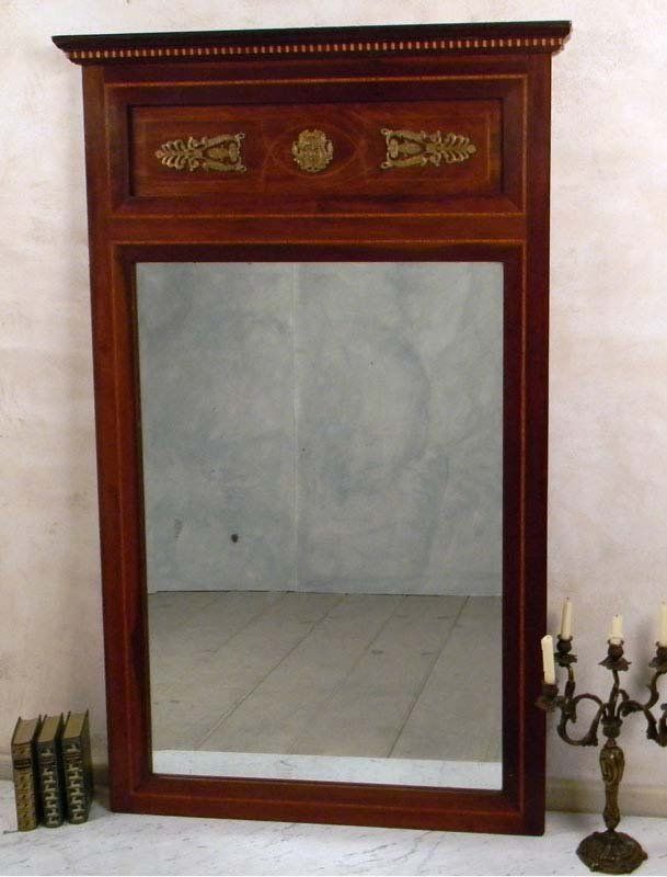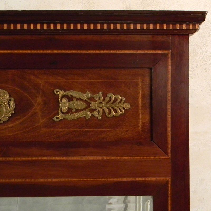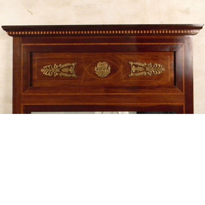 1920?s Empire style mirror made of mahogany wood featuring brass ornaments with inlay wood. 69x44 Inches