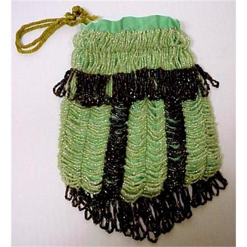 Gorgeous flapper style drawstring beaded purse.Love the pretty colors of the beads: idridescent pastel green and iridescent black-brown beads.It is PRETTY and it feels good to hold with all these cascading rows and rows of lovely beads.Excellent and i do not see any damage on it.This is very much "one of the kind" purse for the serious collector.US Buyer please pay 8.00 for shipping plus insurance.Thank You for looking!