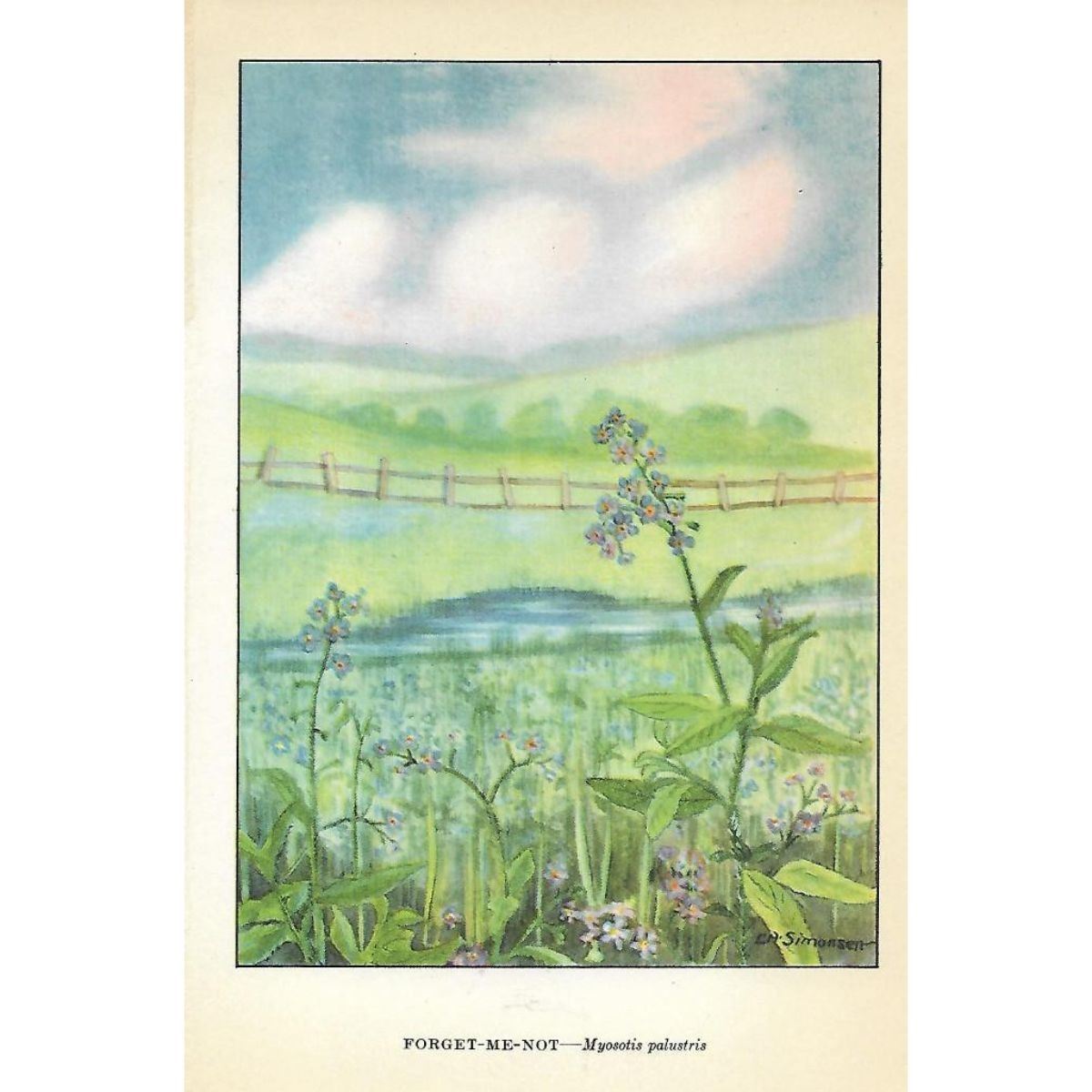 Forget-Me-Not color lithograph print, from a 1926 edition of The Nature Library, Wild Flowers by Neltje Blanchan. 5" X 8". Â