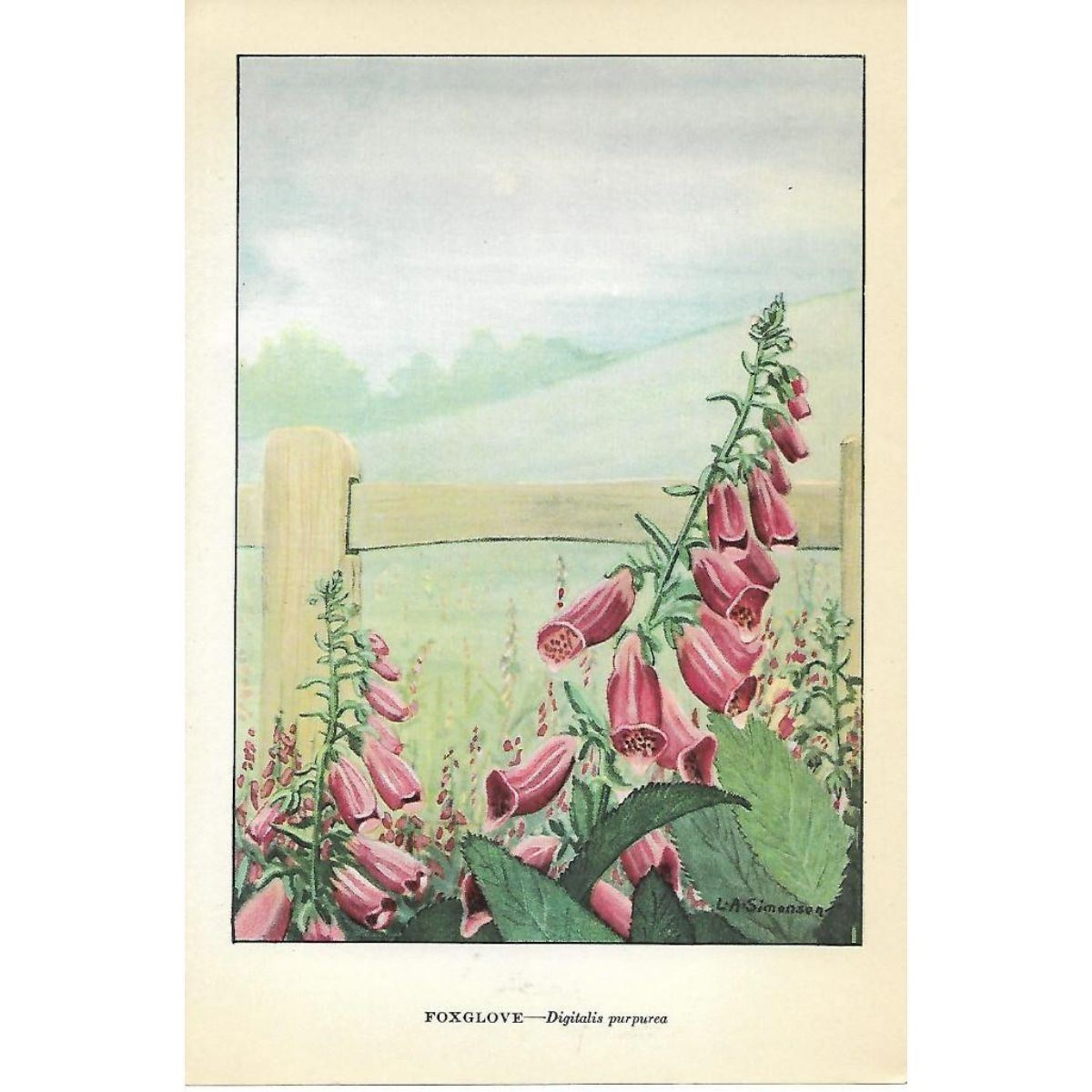 Foxglove color lithograph print, from a 1926 edition of The Nature Library, Wild Flowers by Neltje Blanchan. 5" X 8". Â