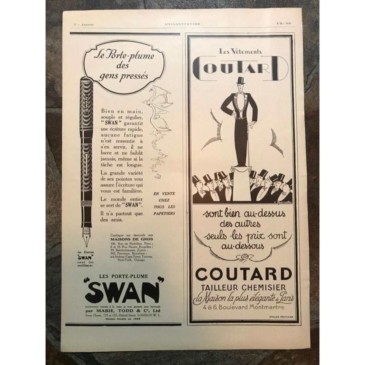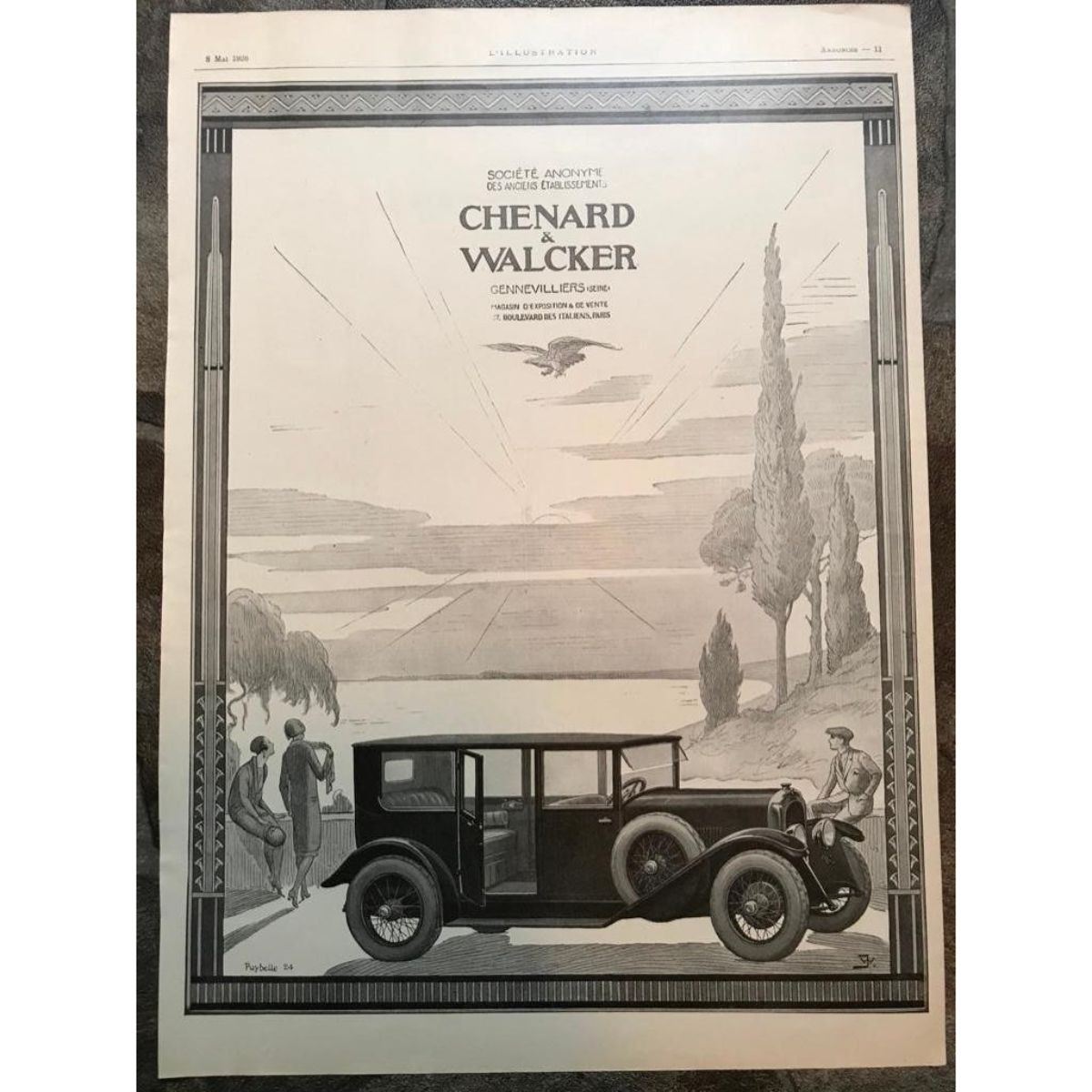 Original 1926 black & white advertisement for Chenard & Walcker automobiles, from a edition of the French Magazine "L'Illustration". 11" X 16". Reverse side of page divided up with 2 ads for Coutard men's tailor & Swan foundtain pens. Chenard-Walcker, also known as Chenard & Walcker, was a French automobile and commercial vehicle manufacturer from 1898 to 1946. Chenard-Walcker then designed and manufactured trucks marketed via Peugeot sales channels until the 1970s. The factory was at first in Asnieres-sur-Seine moving to Gennevilliers in 1906.Â