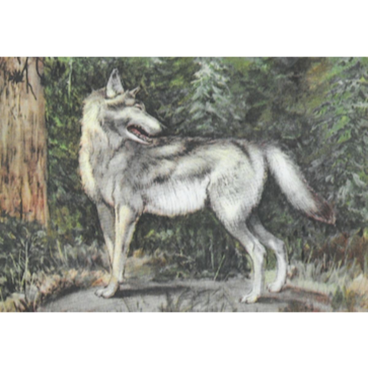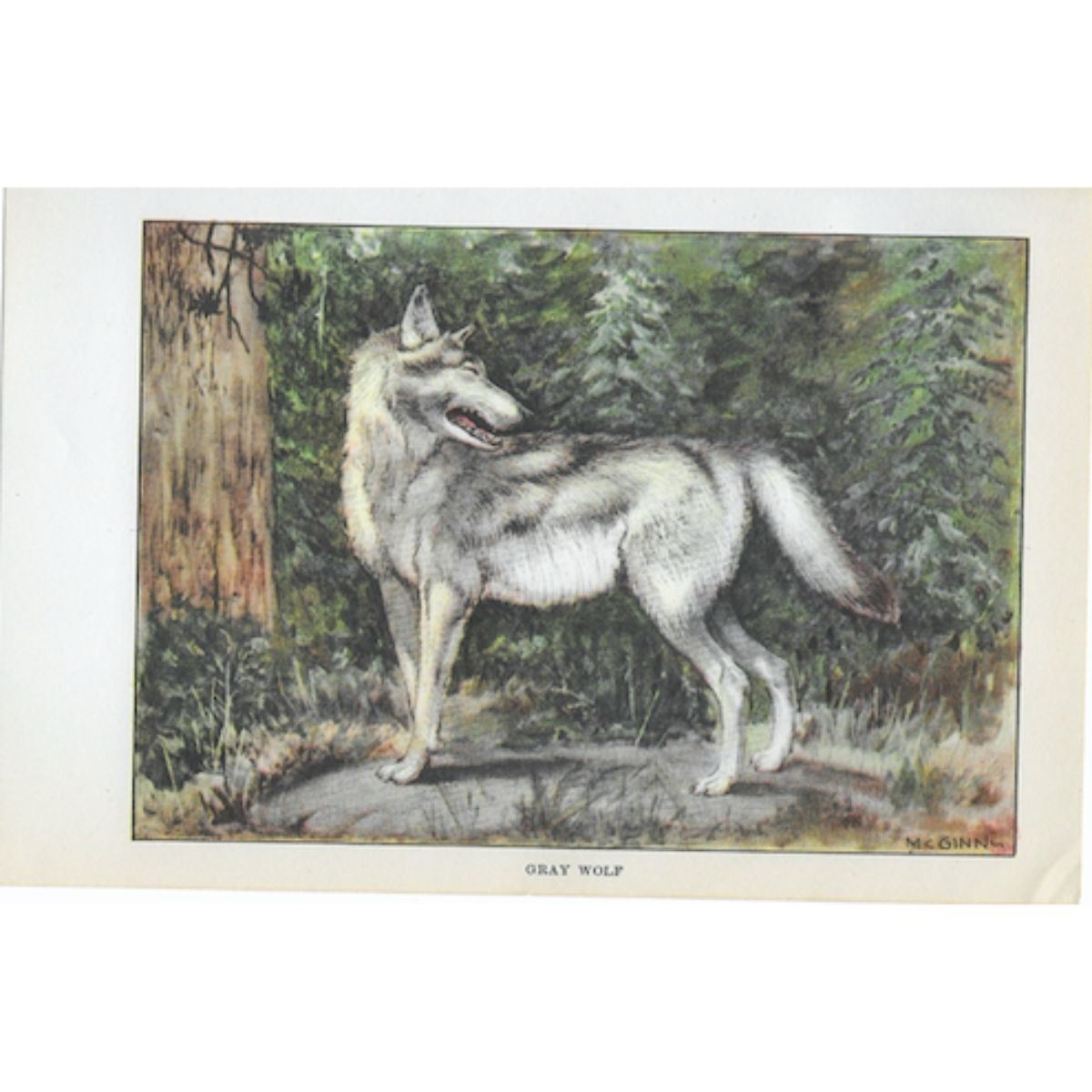 Gray Wolf color lithograph print, from a 1926 edition of The Nature Library, Animals by Ernest Thompson Seton, artwork by McGinn. 5" X 8".