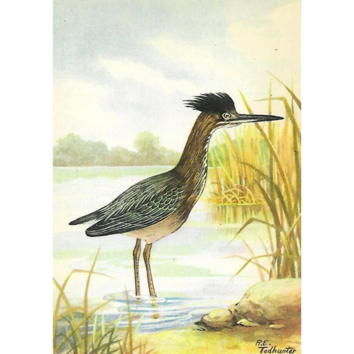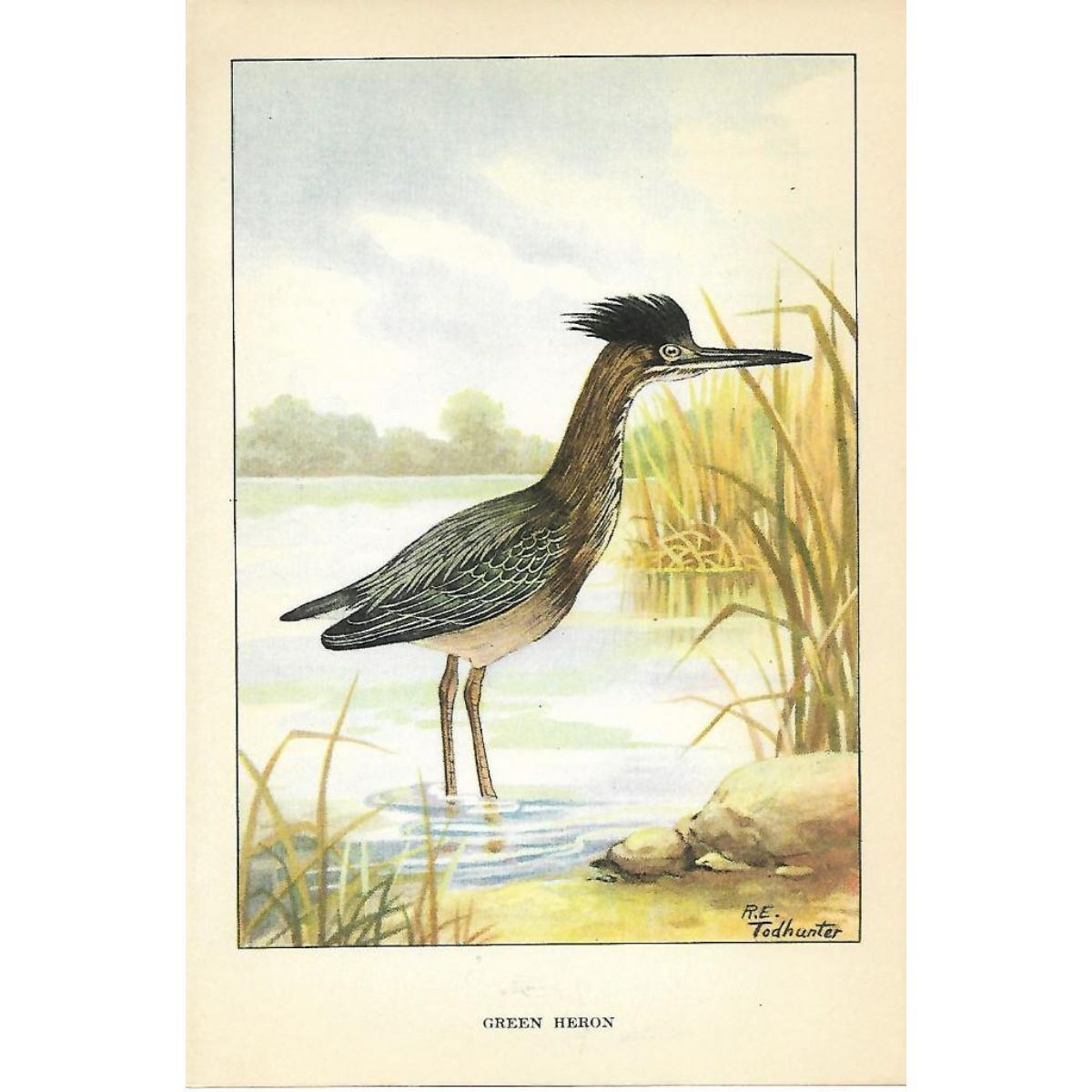 Green Heron color lithograph print, from a 1926 edition of The Nature Library, Birds, selected from writings of Neltjie Blanchan, artwork by R. E. Todhunter. 5" X 8". Â
