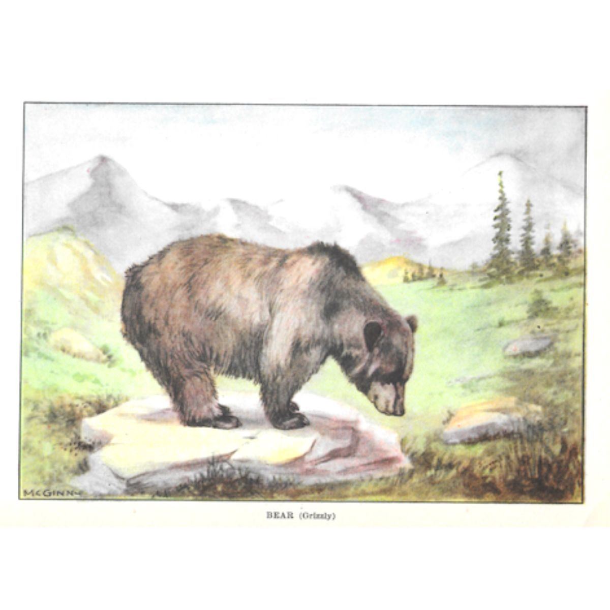 Grizzly Bear, color lithograph print, from a 1926 edition of The Nature Library, Animals by Ernest Thompson Seton, arranged by Robert M McCurdy for Doubleday, Doran & Company. Original artwork by McGinn. 5" X 8".