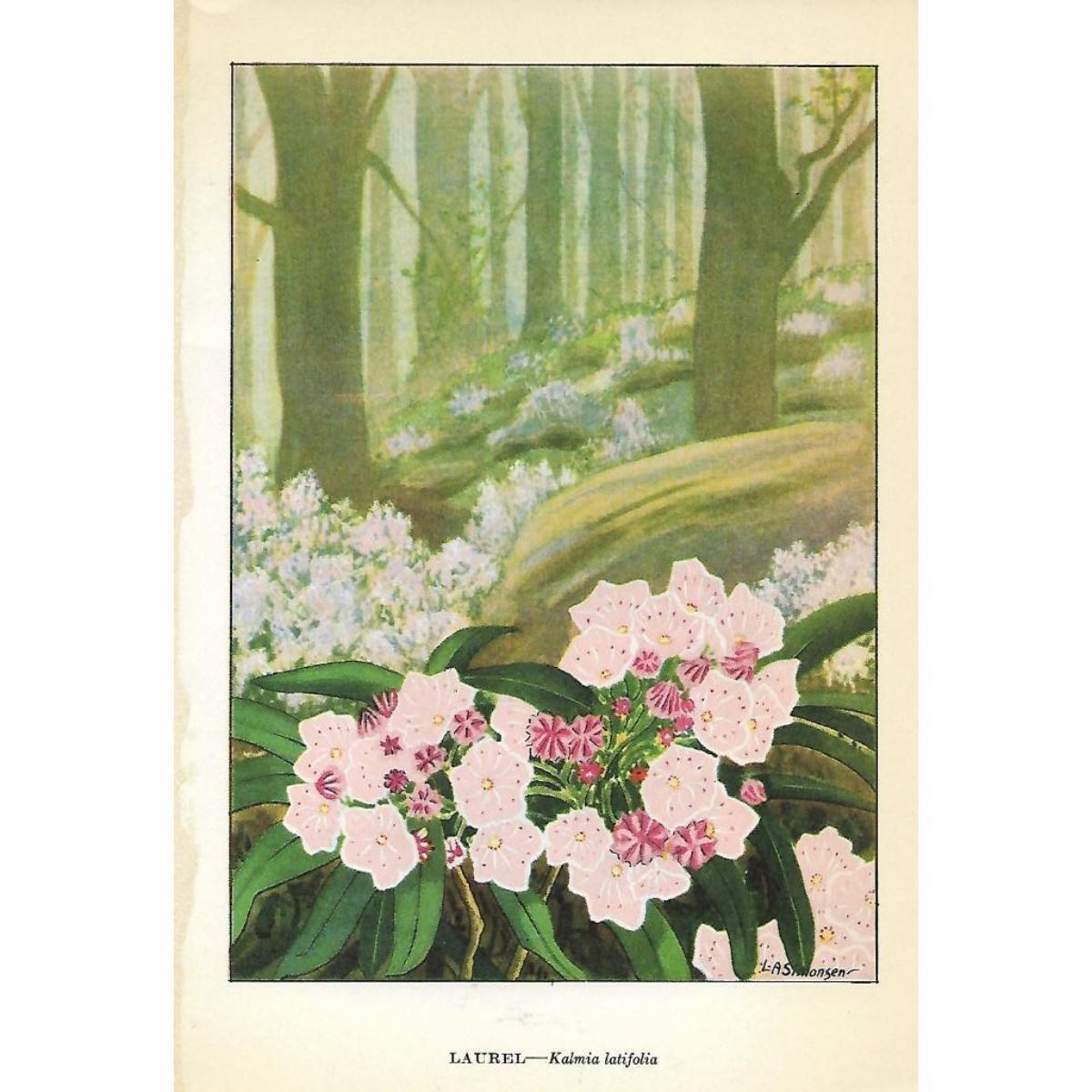 Laurel color lithograph print, from a 1926 edition of The Nature Library, Wild Flowers by Neltje Blanchan. 5" X 8". Â