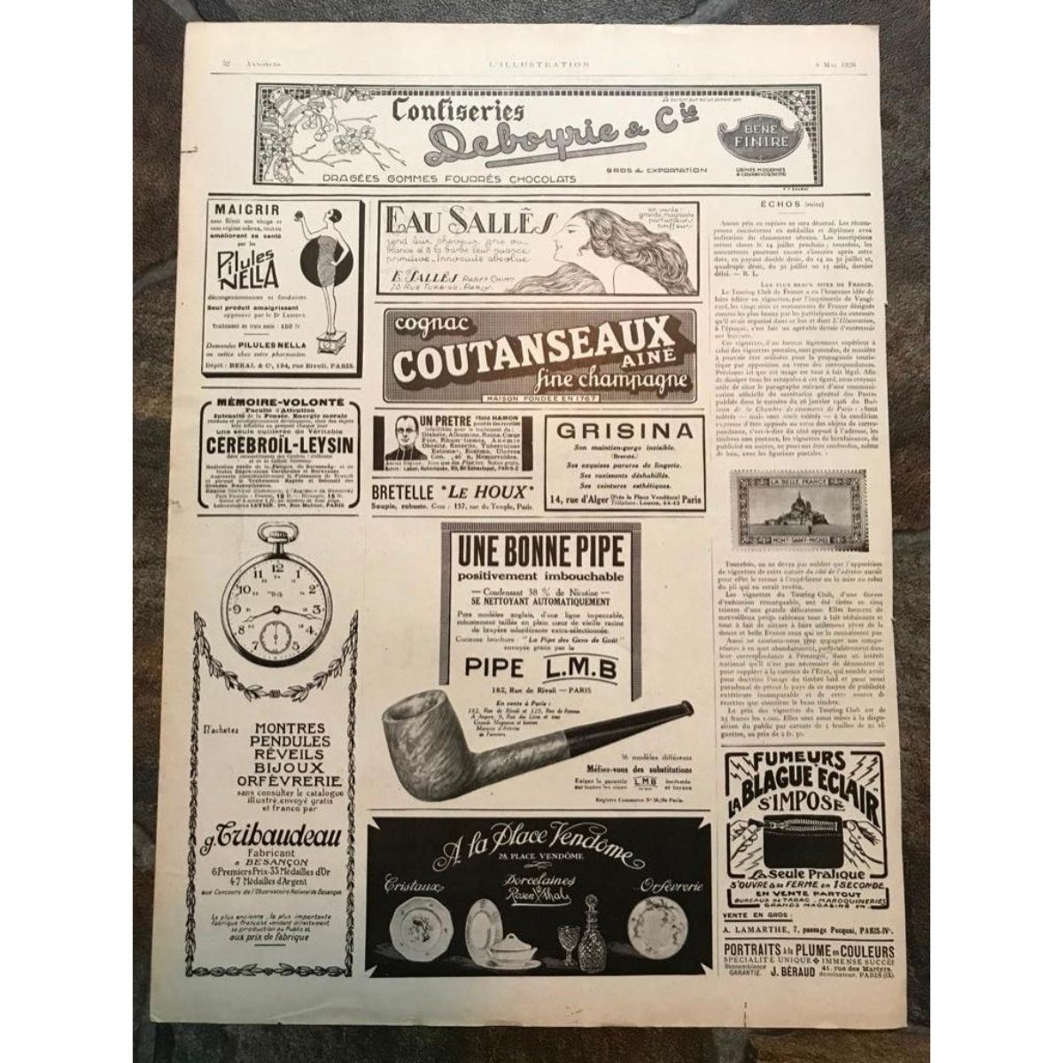 Full page black & white ads from a 1926 issue of L'Illustration Magagzine. Bottom 1/2 page illustration ad for Georges Irat Paris Automobiles & top 1/2 page ad from "Monbrosia" by Lubin Prafumeur Paris. Reverse side ads for pocket watches, pipes & porcelain dishes & cognac etc. 11 1/2" X 16".
