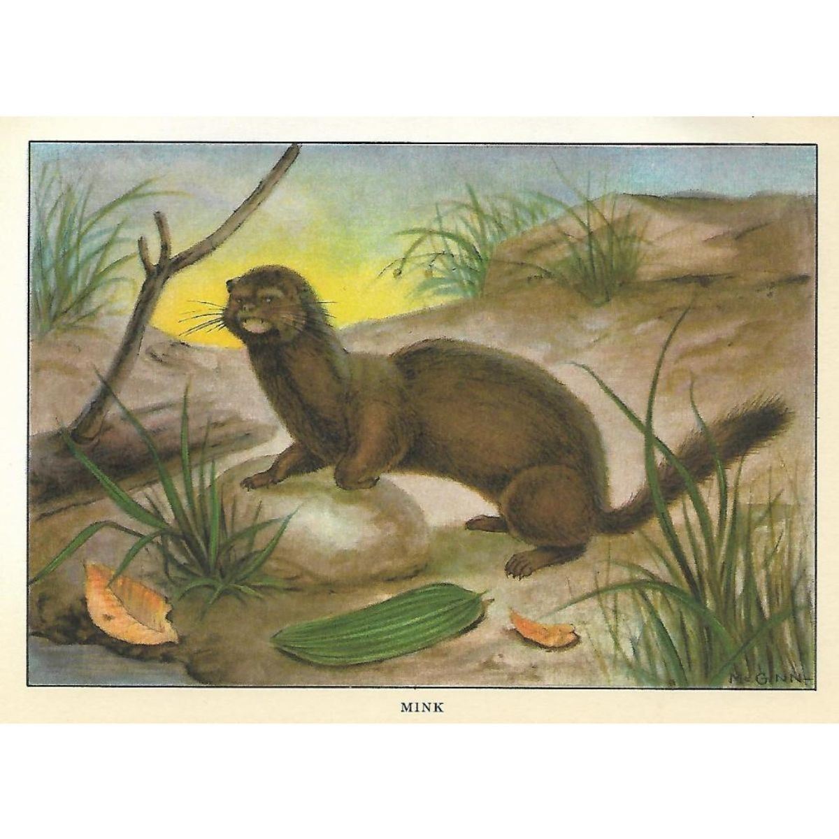 Mink color lithograph print, from a 1926 edition of The Nature Library, Animals by Ernest Thompson Seton, illustrations by McGinn. 5" X 8". Â