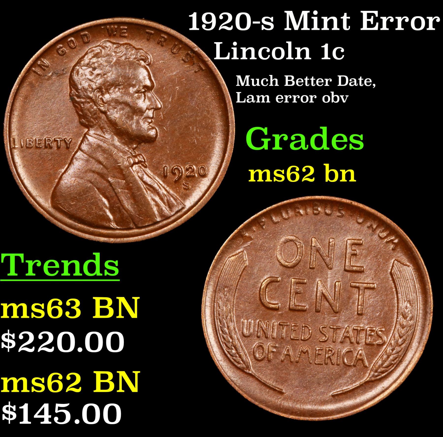 1920-s Mint Error Lincoln Cent 1c Grades Select Unc BN.