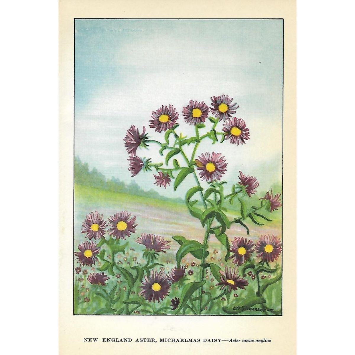 New England Aster, Michaelmas Daisy color lithograph print, from a 1926 edition of The Nature Library, Wild Flowers by Neltje Blanchan. 5" X 8". Â