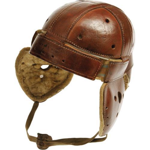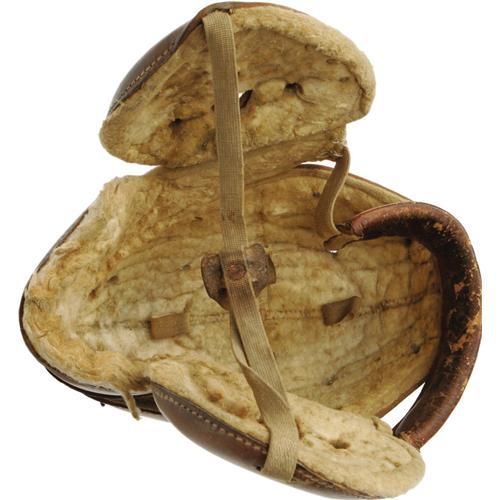 <B>1920's Notre Dame Game Worn Helmet.</B></I> Leather "dog ear" style gamer features "Guaranteed Athletic Co" logo stamped at back of helmet (perhaps a forerunner to MacGregor or Goldsmith?), with ancient "Notre Dame" stamped above the brow to identify the equipment's allegiance. Interior features thick wool or cotton padding applied in a "suspension" style. Original chinstrap is present. Condition is remarkable for a piece of this vintage, with no damage to note save for a bit of dark staining at the crown which could be game related. One example from an incredible run of Notre Dame helmet styles offered within this auction. <I>LOA from Lou Lampson.</B></I><BR><BR><b>Shipping:</b> Miscellaneous Collectibles, Larg (<a target="_blank" href="http://www.heritageauctions.com/common/shipping.php">view shipping information</a>)