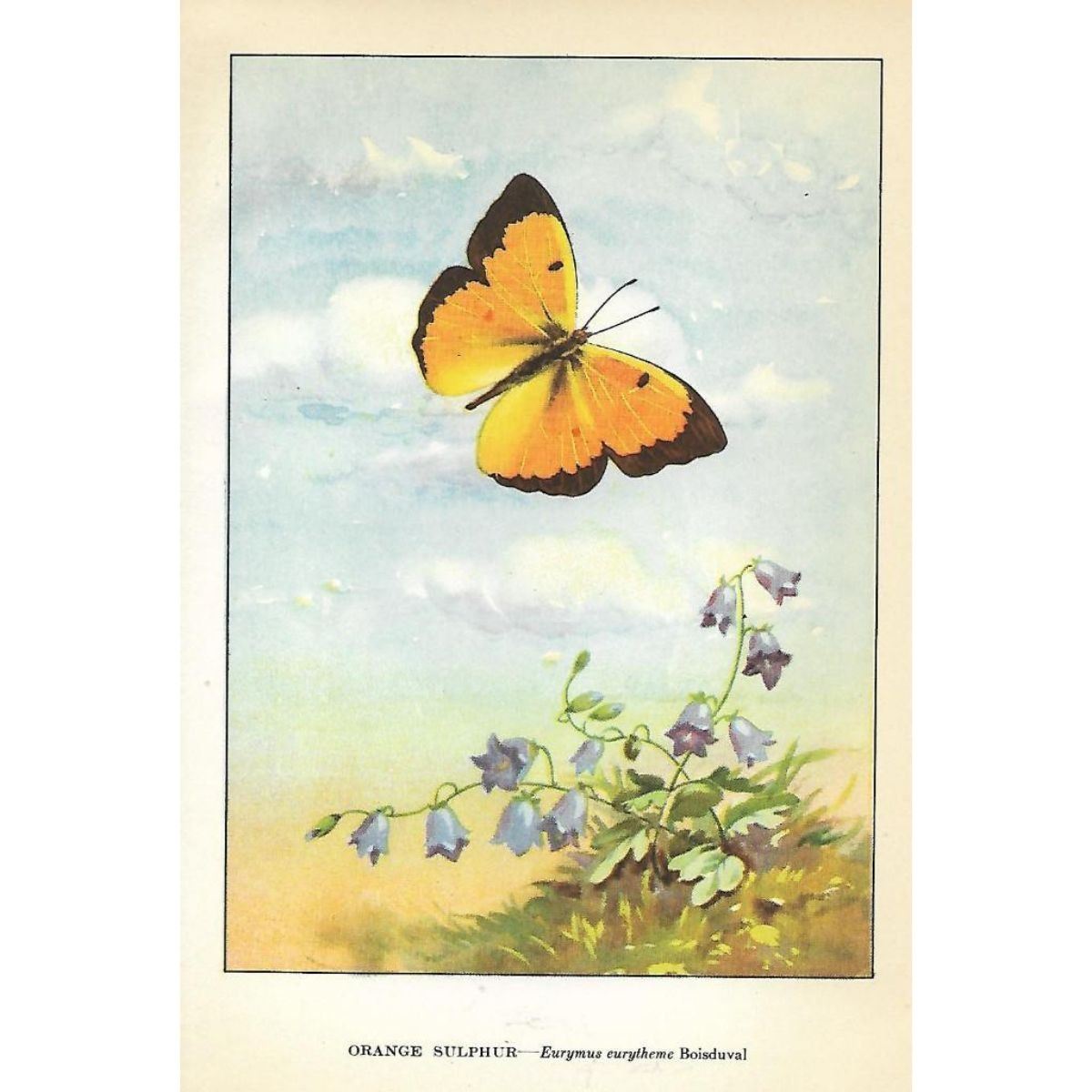 Orange Sulphur butterfly color lithograph print, from a 1926 edition of The Nature Library, Animals by Clarence M. Weed. 5" X 8". Â
