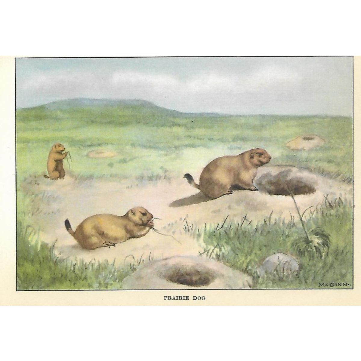 Prairie Dog color lithograph print, from a 1926 edition of The Nature Library, Animals by Ernest Thompson Seton, illustrations by McGinn. 5" X 8". Â