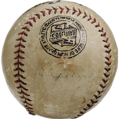<B>1920's Ruth, Gehrig, Cobb, Pennock & Combs Signed Baseball.</B></I> Not a bad bunch of names, is it? One savvy fan of Golden Age baseball resisted the temptation to hand this "State League" ball over to just anybody with a glove or a bat, seeking out the cream of the crop instead. Now a lucky bidder will become the beneficiary of this fan's wisdom, as we're able to present this most exclusive of signed spheres on the auction block. Taking up his permanent sweet spot residence is the Babe (5/10) himself, with Lou Gehrig (3/10) on the panel to his left and Ty Cobb (7/10) to his right. Lefty Gomez (9/10) above is the strongest of the bunch, with Earle Combs (4/10) and Herb Pennock (5/10) downstairs. The ball shows a fair amount of surface wear, but our catalog photography should illustrate that the effects are not that dramatic. Five playing-days 1920's Hall of Famers for the price of one! <I>LOA from PSA/DNA. LOA from James Spence Authentication.</B></I><BR><BR><b>Shipping:</b> Balls, Pucks, etc., Small (<a target="_blank" href="http://www.heritageauctions.com/common/shipping.php">view shipping information</a>)