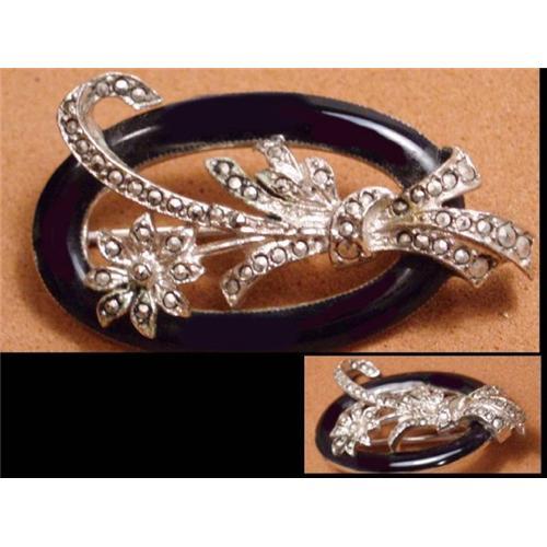 <tr><td>Title:1920's STERLING ONYX Marcasite Layered BROOCH</td></tr>