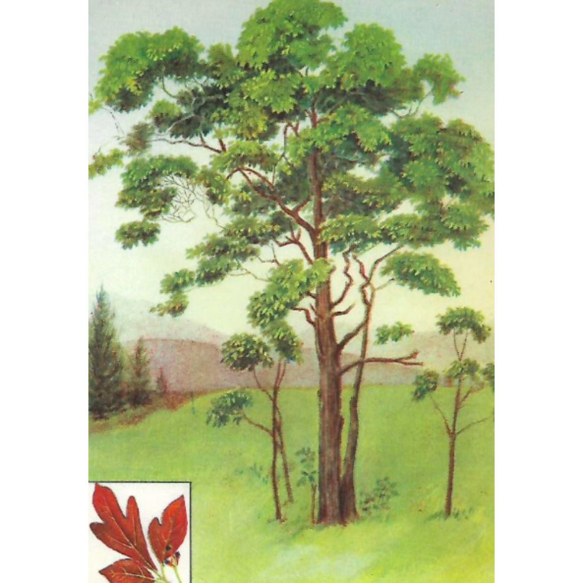 Sassafras color lithograph print, from a 1926 edition of The Nature Library, Trees by Julia Ellen Rogers. 5" X 8". Â