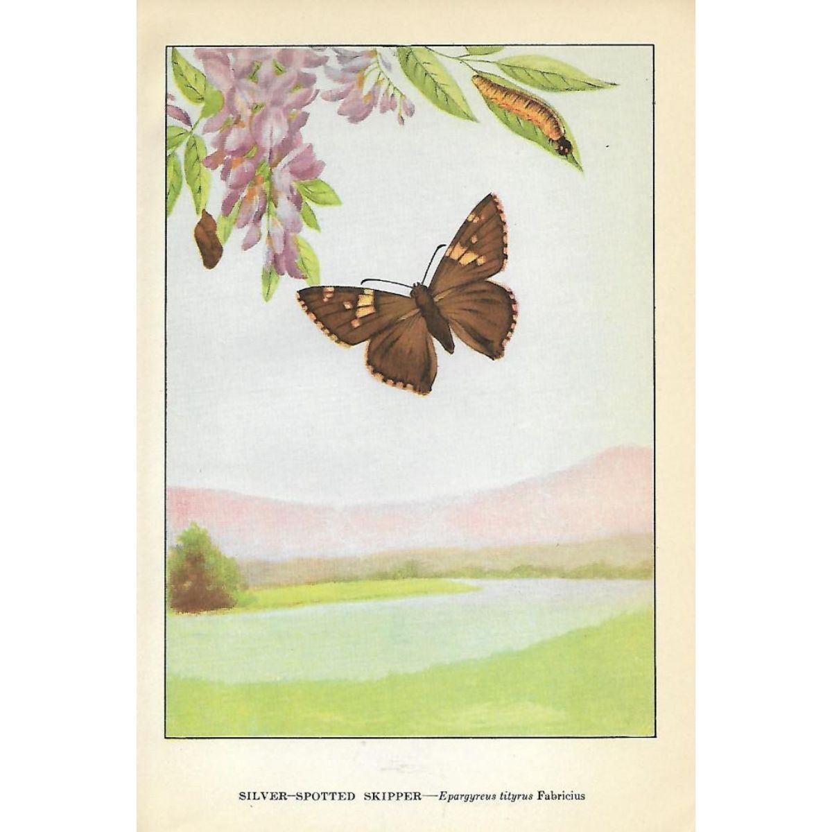 Silver-Spotted Skipper butterfly color lithograph print, from a 1926 edition of The Nature Library, Animals by Clarence M. Weed. 5" X 8". Â