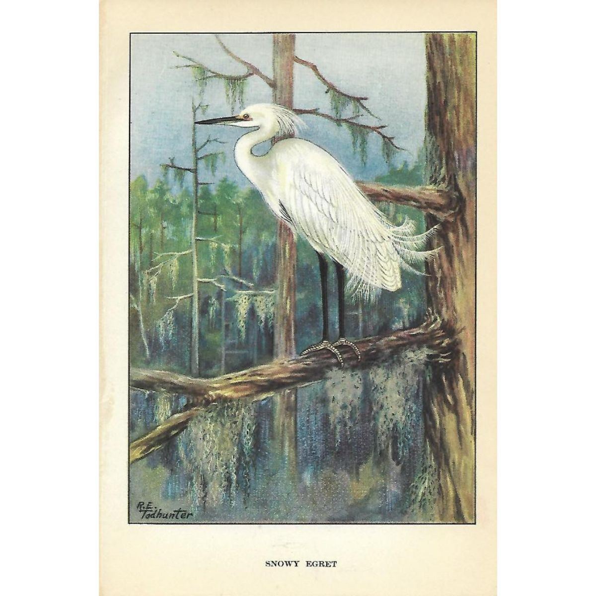 Snowy Egret color lithograph print, from a 1926 edition of The Nature Library, Birds, selected from writings of Neltjie Blanchan, artwork by R. E. Todhunter. 5" X 8". Â