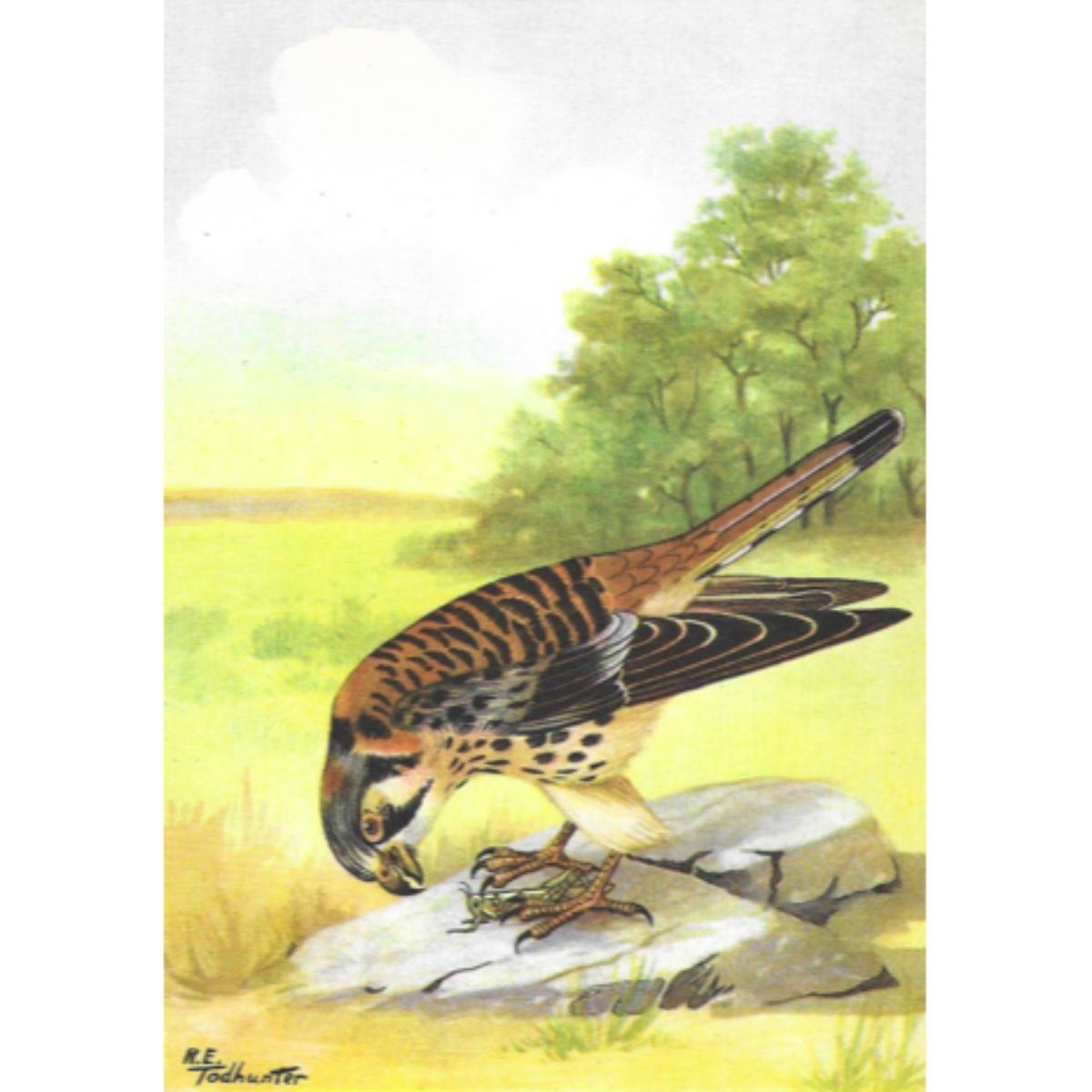 Sparrow-Hawk, color lithograph bookplate print from a 1926 edition of "The Nature Library" Birds volume. Original art by R.E. Todhunter for Doubleday, Doran & Company, Inc. 5" X 8".