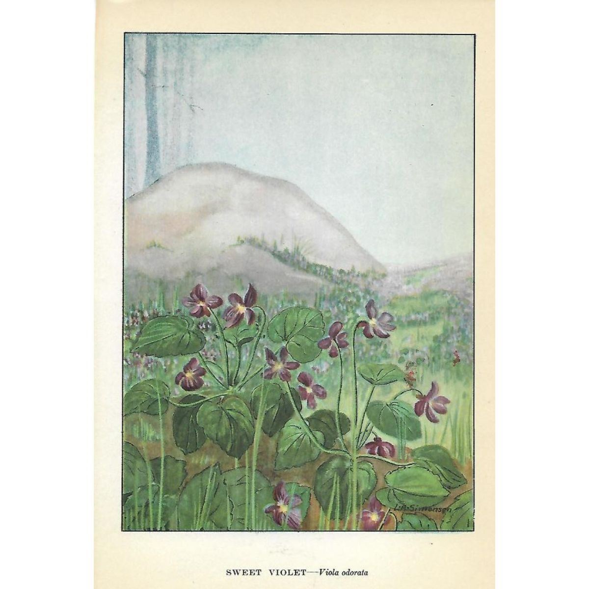Sweet Violet color lithograph print, from a 1926 edition of The Nature Library, Wild Flowers by Neltje Blanchan. 5" X 8". Â
