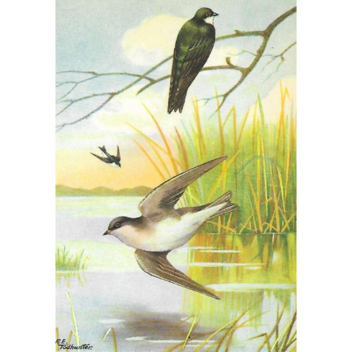 Tree Swallow color lithograph print, from a 1926 edition of The Nature Library, Birds, selected from writings of Neltjie Blanchan, artwork by R. E. Todhunter. 5" X 8". Â