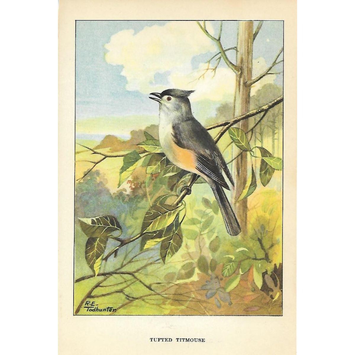 Tufted Titmouse color lithograph print, from a 1926 edition of The Nature Library, Birds, selected from writings of Neltjie Blanchan, artwork by R. E. Todhunter. 5" X 8". Â