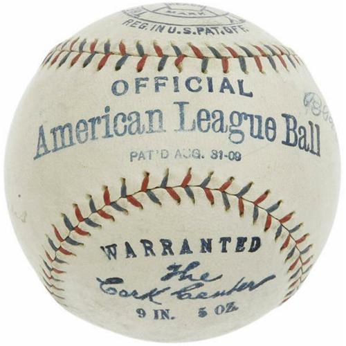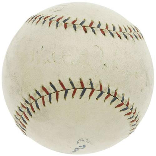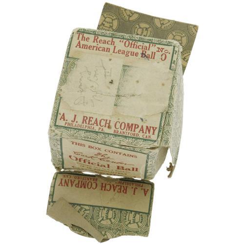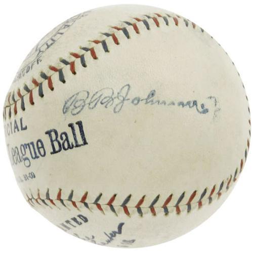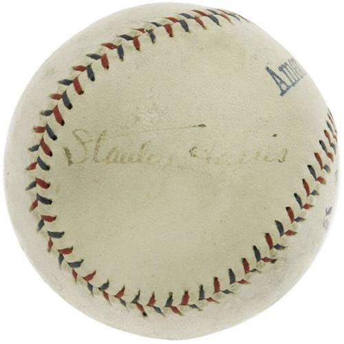 <B>1920's Walter Johnson Signed Baseball.</B></I> Though the Big Train's sweet spot signature may have faded a fair amount since its application close to eight decades ago, it is nonetheless discernible, and willing and able to fill the empty space in many a Hall of Fame autograph collection. The OAL (Ban Johnson) baseball on which it resides is a valuable commodity in its own right, and it presents gorgeously, with the deep, dark stamping failing to take the same path as the ink that forms Johnson's signature. Fellow Hall of Famer Stanley Harris, known to his friends as "Bucky," appears on the side panel above Walter, a couple points stronger at 4/10. A well-worn original box holds this rare treasure, which sees the auction block for the first time with this offering. <I>LOA from PSA/DNA. LOA from James Spence Authentication.</B></I><BR><BR><b>Shipping:</b> Balls, etc. (<a target="_blank" href="http://www.heritageauctions.com/common/shipping.php">view shipping information</a>)