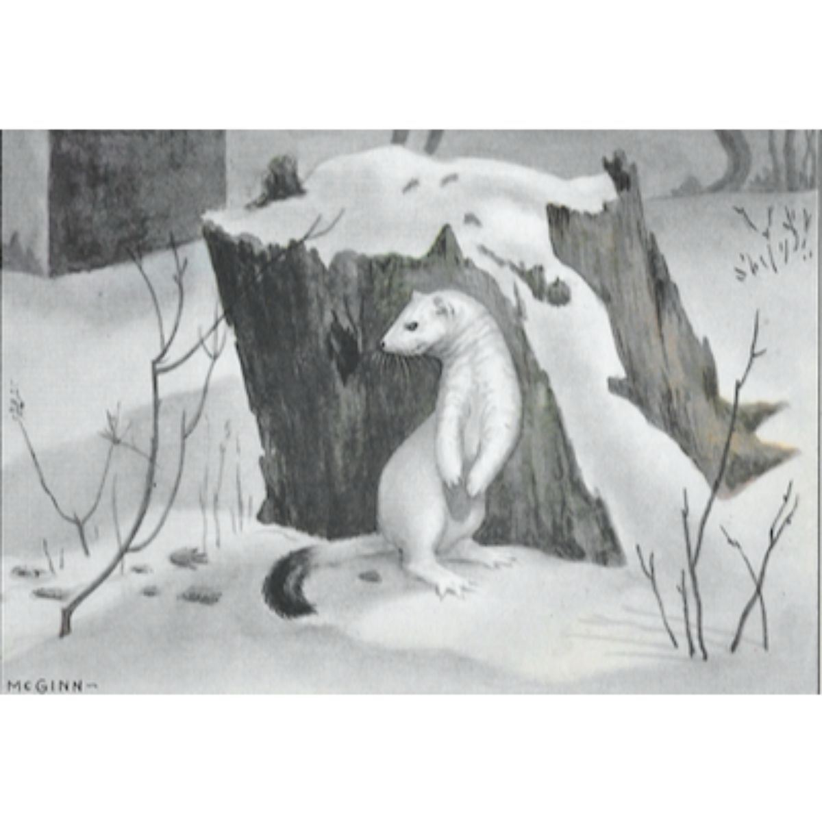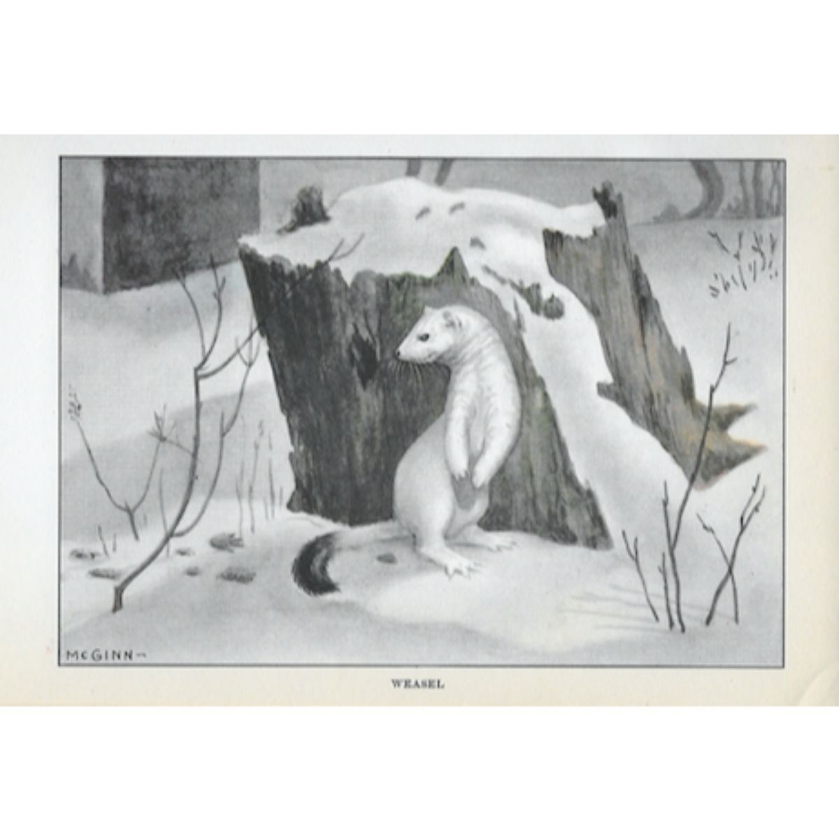 Weasel color lithograph print, from a 1926 edition of The Nature Library, Animals by Ernest Thompson Seton, artwork by McGinn. 5" X 8".