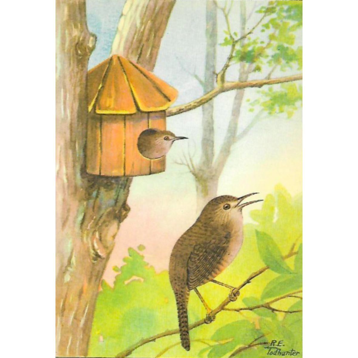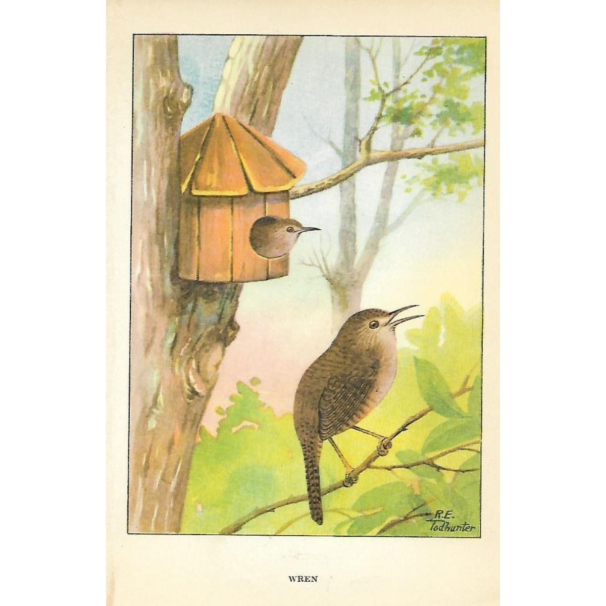 Wren color lithograph print, from a 1926 edition of The Nature Library, Birds, selected from writings of Neltjie Blanchan, artwork by R. E. Todhunter. 5" X 8". Â
