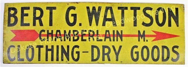 1920's tin sign Bert G Watsons Dry Goods Store, located in Chanberlain, SD, listed in early business