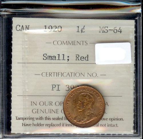 1920 small cent ICCS MS64 Red, 95% red lustre. Nice!
