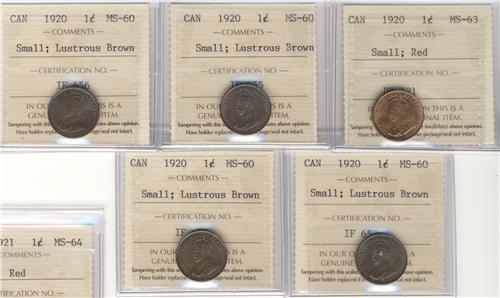 1920 sml 1¢. Lot of 5 coins all ICCS certified. 1 x MS63RD (full red) and 4 x MS60 lustruous brown. All coins sharb with lots of lustre and no negative comments.