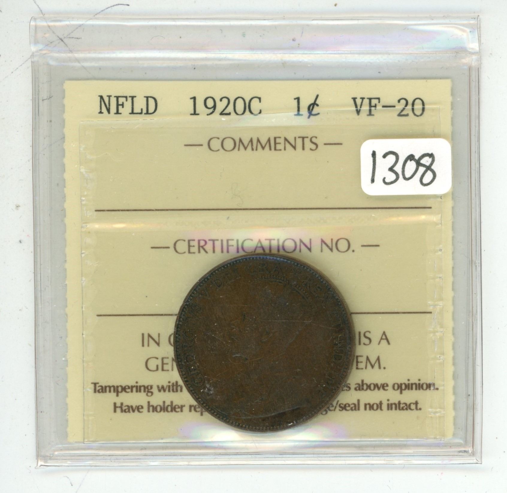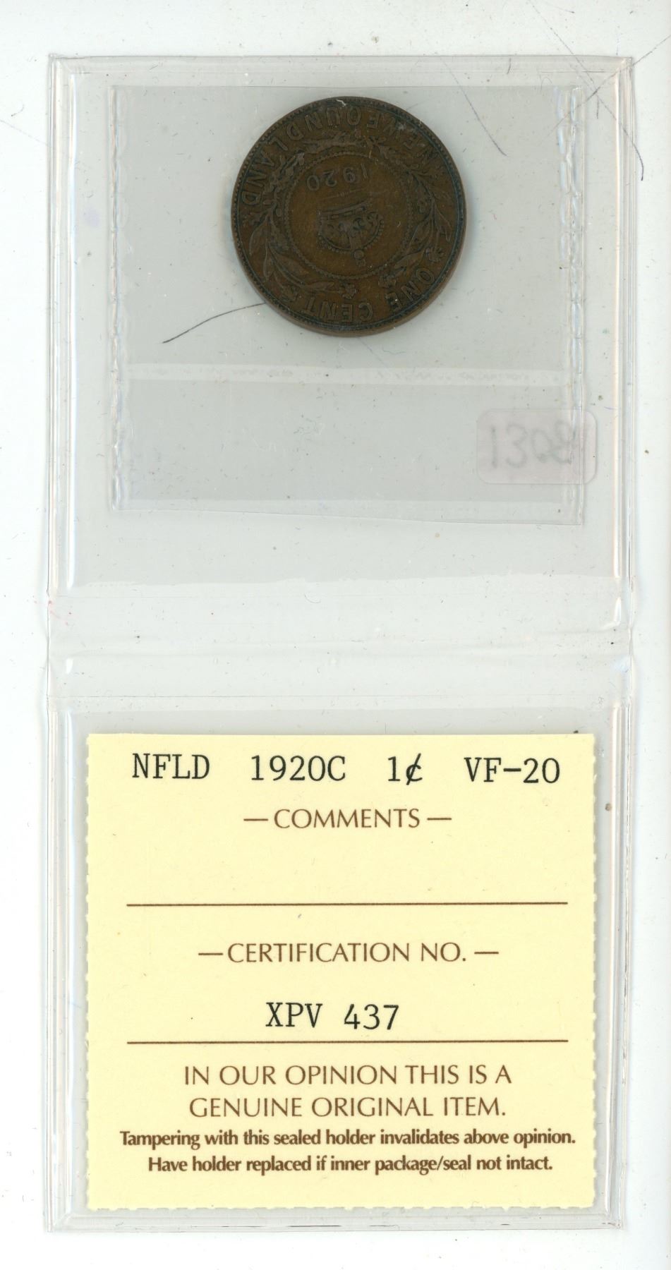 1920C ICCS graded, NFLD Canadian large cent coin - VF20